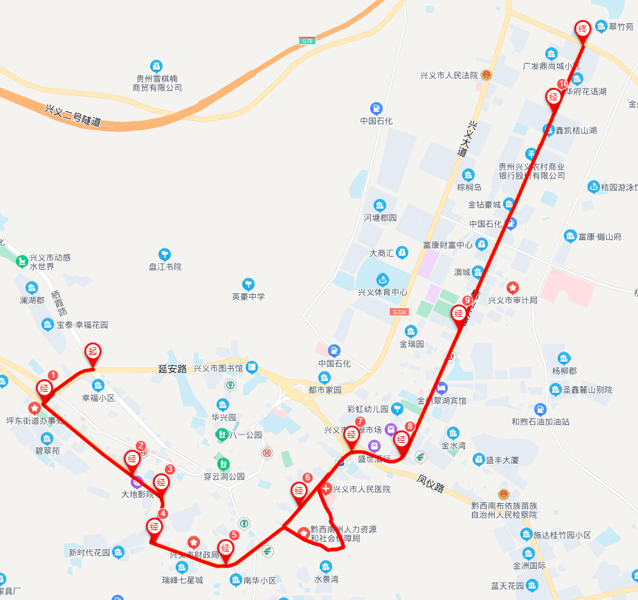 起点)延安路与幸福路交叉处红绿灯→栖霞路通过龙头山隧道→坪东西路→南环路经将台营隧道至北京路立交桥→桔山大道→(终点)桔山大道与峡谷大道交叉处红绿灯。