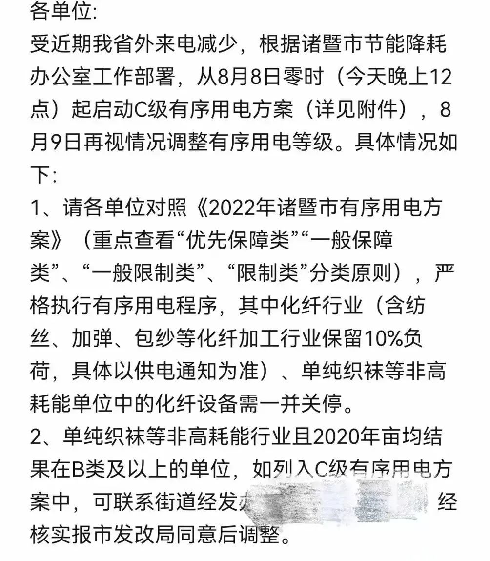 8月6日,浙江省发改委印发《关于同意启动C级有序用电的函》,文件中指出:浙江省8月8日根据用电缺口实际情况启动C级1250万千瓦有序用电措施。